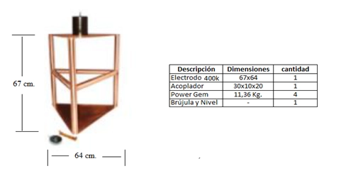 Kit de electrodo electromagnético de cobre electrolítico de alta conductividad con tratamiento anticorrosivo. Incluye dispositivo de filtración LCR, acoplador de 400 amperios con gabinete NEMA 4 y aditivo Power Gem certificado LAPEM. Ideal para sites de cómputo y aplicaciones de alta demanda.
