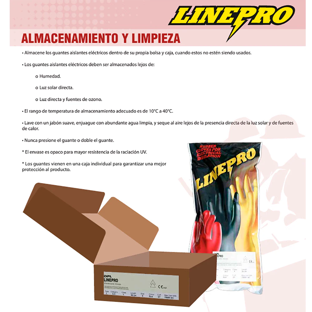 Guantes dieléctricos DPL-Linepro de categoría III según la directiva europea 89/686/EEC. Fabricados en caucho natural de alta calidad con propiedades dieléctricas excepcionales. Diseño ergonómico y anatómico que minimiza la fatiga y proporciona máxima flexibilidad. Resistentes a ácidos, aceites, ozono y bajas temperaturas. Disponibles en 6 clases de protección desde 500V hasta 36.000V. Cada guante es inspeccionado individualmente y sometido a pruebas rigurosas de aislación eléctrica.
