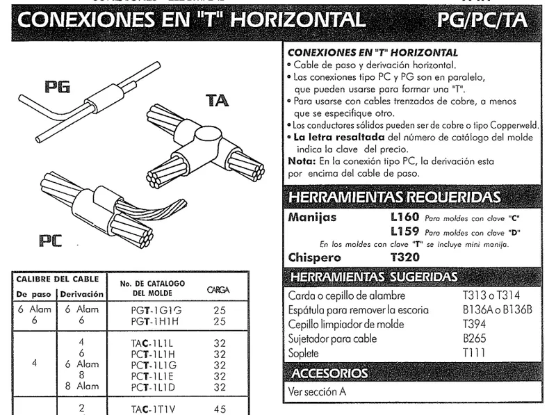 Familia de moldes de grafito tipo T para conexiones en T de cables y a riel. Incluye conexión T horizontal run-tap (TA) y cable a riel (TP). Moldes de alta densidad resistentes a temperaturas superiores a 2.500°C. Compatible con cargas ESTWELD y Electro Material.