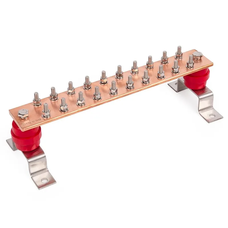 Placa PGB o BDT de cobre macizo C1100 de alta conductividad (99.9% pureza) con aisladores SM40 de poliéster certificados UL. Kit completo de montaje en pared que incluye barra de cobre, aisladores, soportes y pernería de acero inoxidable. Diseñada para gabinetes de distribución eléctrica, conexiones de puesta a tierra de equipos y distribución de energía en instalaciones de baja y media tensión. Soporta hasta 1500A y corrientes de rayo de hasta 200 kA.